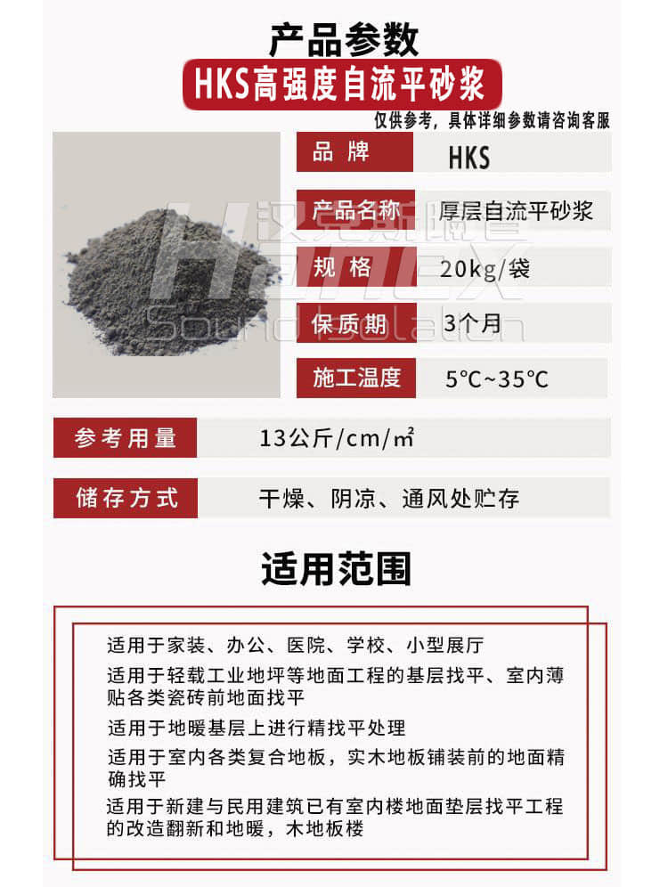 高强度自流平砂浆是一种新型的楼板保温找平一体系统和地暖回填材料。它以水泥、高强水泥、石膏复合做为胶凝材料,添加微晶、级配骨料、填充料、可再分散乳胶粉、及各种高分子功能添加剂等混合而成,是一款新拌时流动性好,早期强度高,施工方便,平整度高,不易开裂的新型材料。该材料可同时做为楼板保温层与面层。