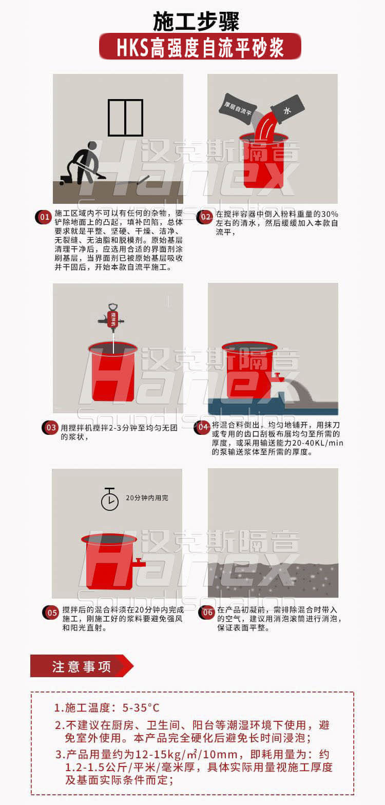 1.自流平砂浆加水量为35+2%,无需添加其他任何成份,先将水放入搅拌桶,再倒入自流平砂浆,用电动搅拌器搅拌2-5分钟,应充分搅拌均匀