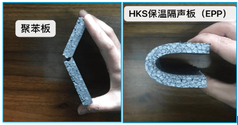 全面可弯曲:XPS、EPS(聚苯板)受力易断裂,而HKS保温隔声板(EPP)可以实现180°弯曲。