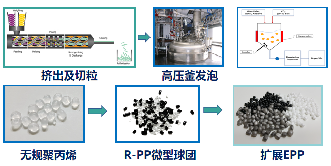 把特种处理的聚丙烯微晶颗粒,放入高压(50大气压)和高温(150℃)的高压釜中,用CO2作为发泡剂浸渍,可以制备出发泡聚丙烯颗粒。