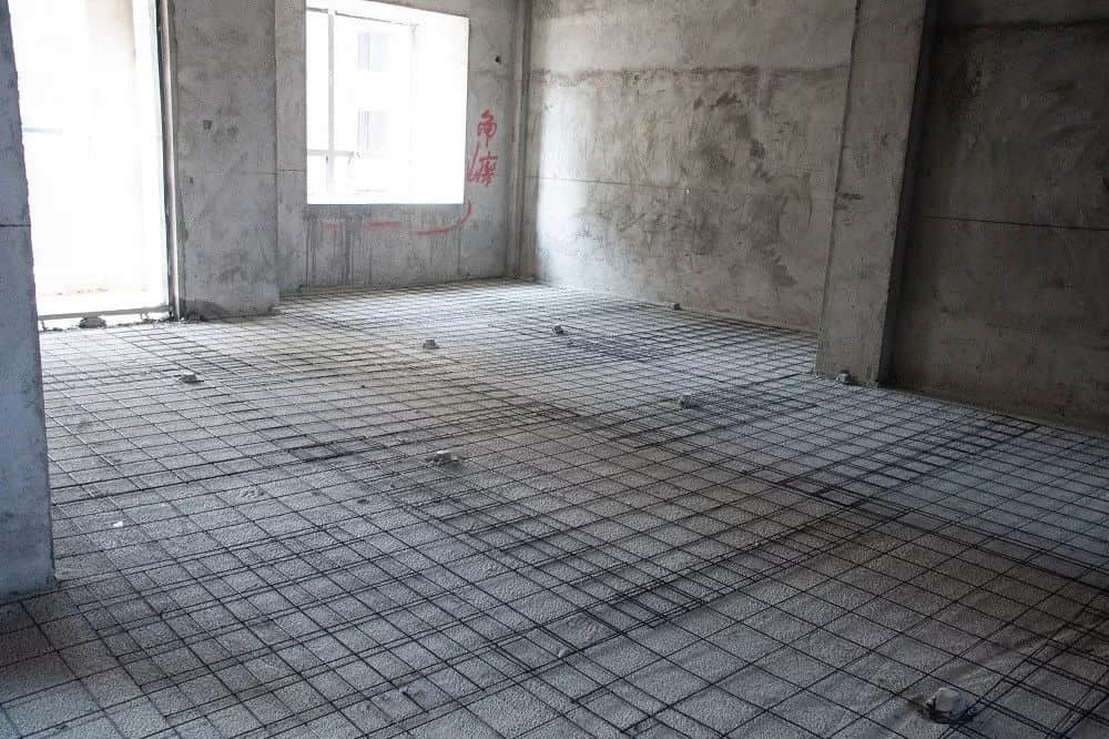 b.其次改性聚丙烯保温隔声板铺设完毕后开始浇筑混凝土(浇筑混凝土?;げ闶保笆毙拚纸钔奈恢?。墙角处、穿楼板管道处浇筑混凝土时,不得将混凝土浇入竖向隔离片和墙体之间。),混凝土?;げ阒胁坑ε渲酶纸钔?钢筋网片应洁净、无损伤,可在钢钢筋网片下面垫上垫块,确保钢筋网片置于混凝土?;げ愕闹屑湮恢?,钢筋绑扎时,应避免铁丝头刺破HKS改性聚丙烯保温隔声板和防水胶带)。